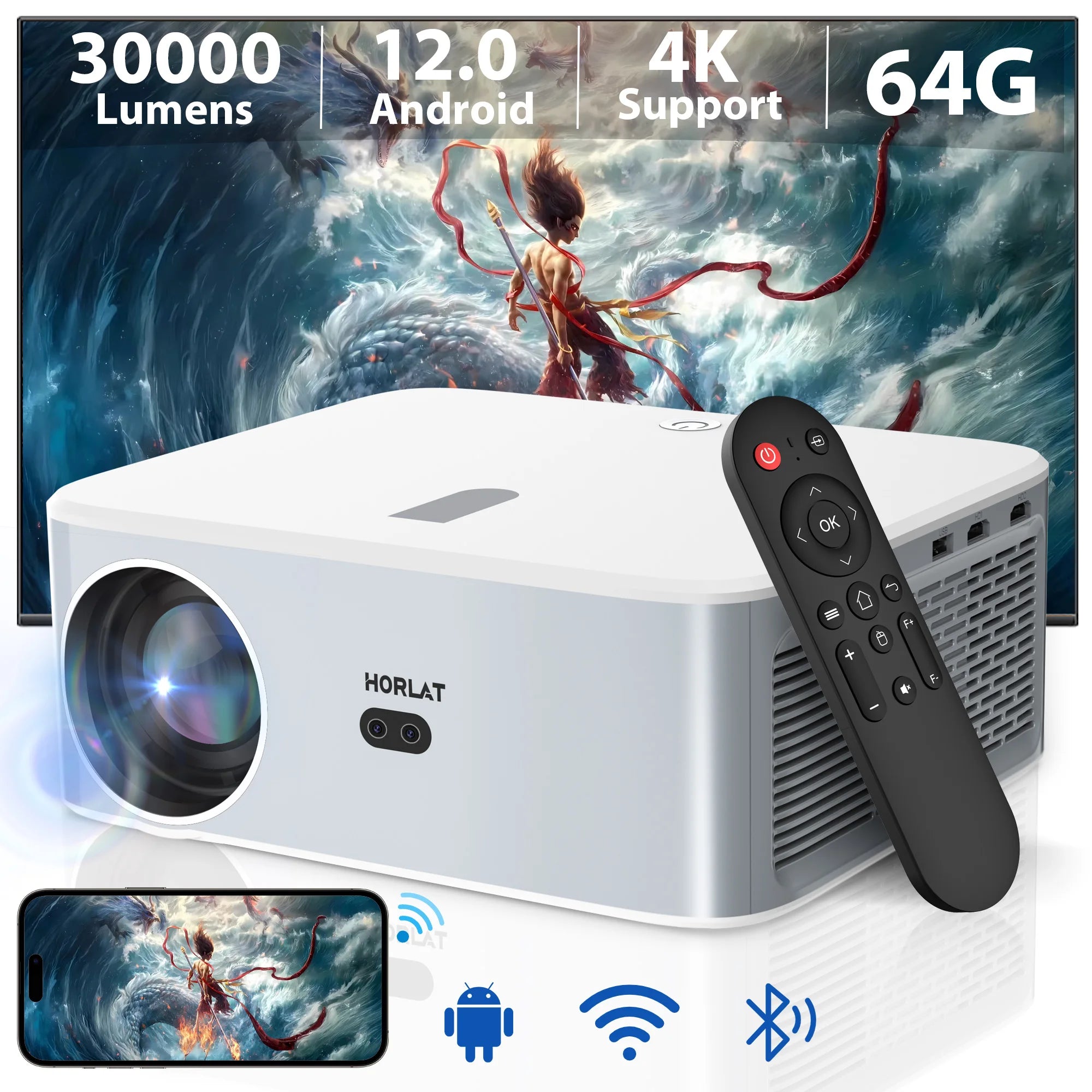 HORLAT 30000Lumens Android12 4K Decode Outdoor Projector Full HD 1080P Video 3D Home Theater Keystone 5G WiFi Portable Proyector